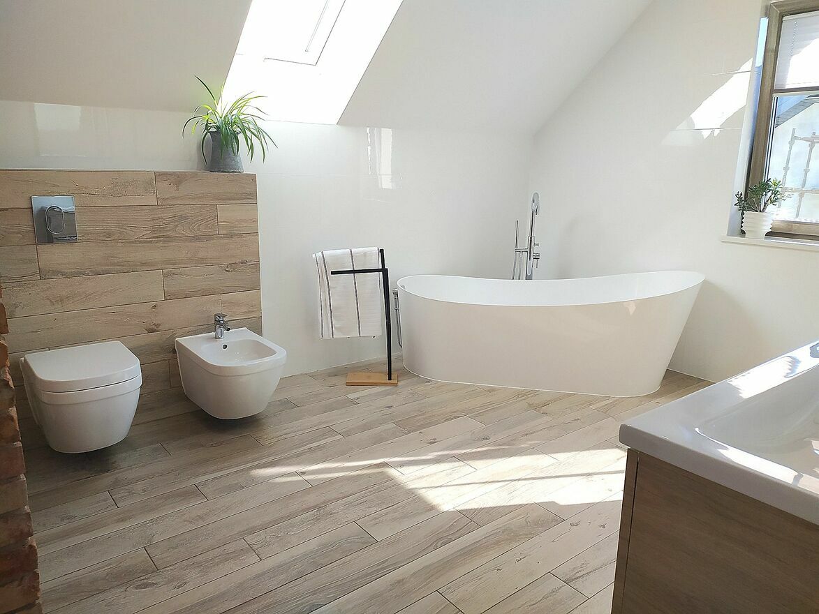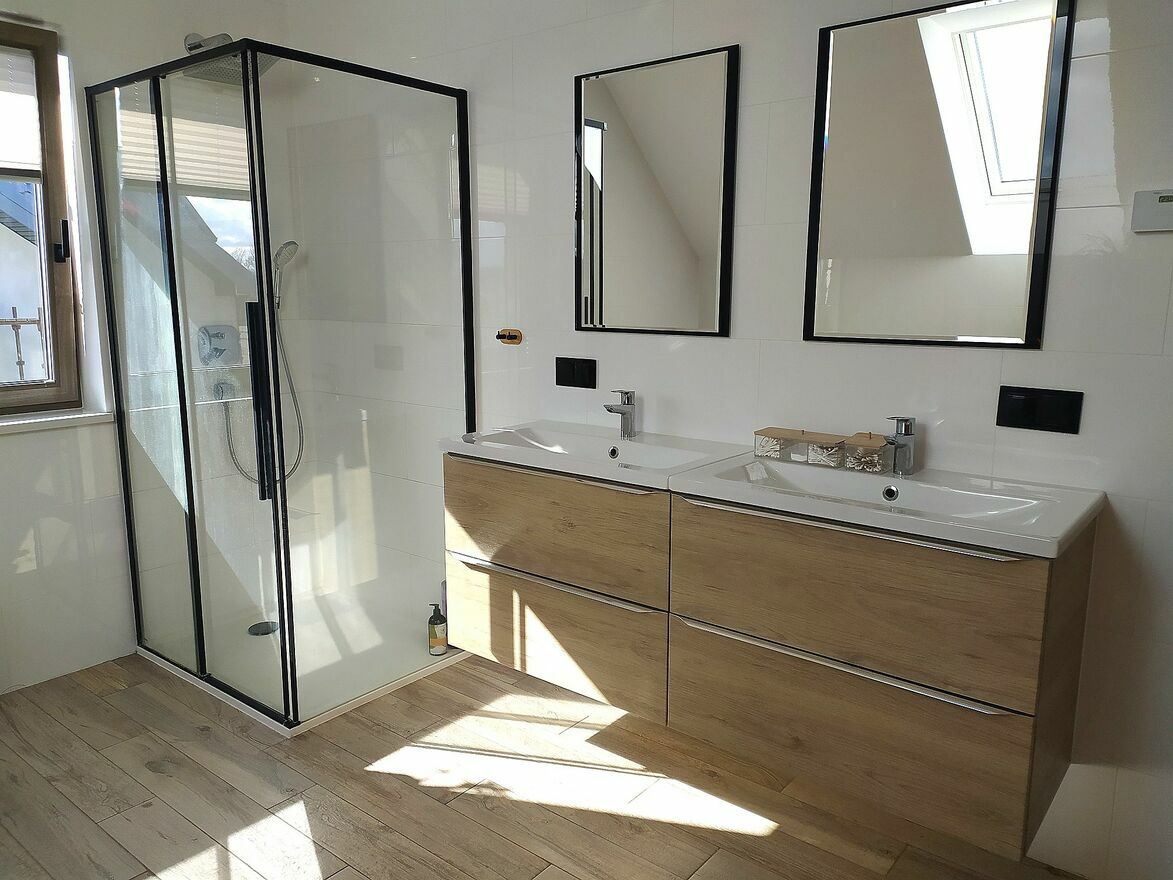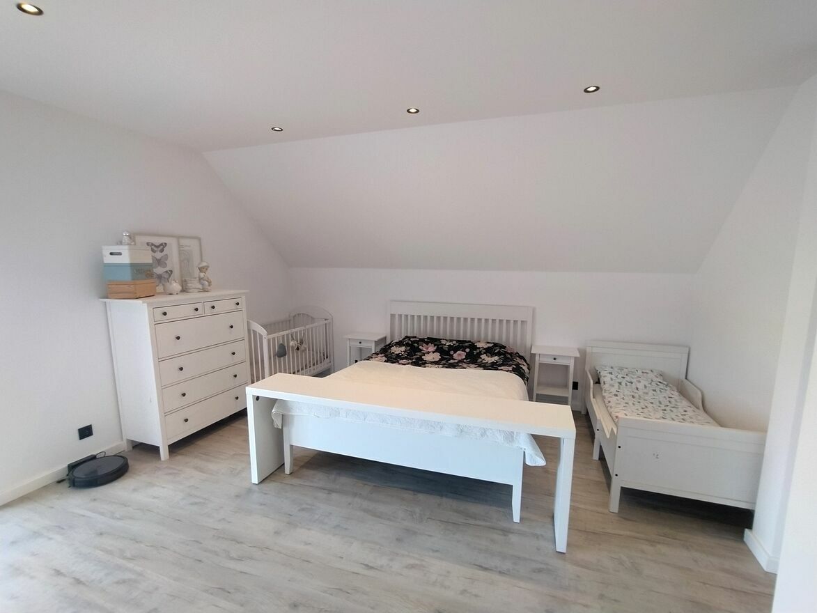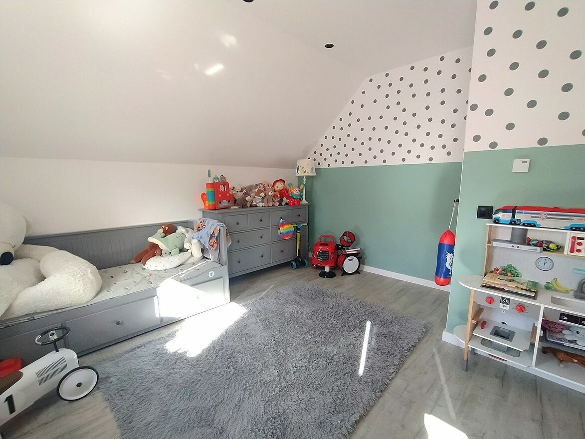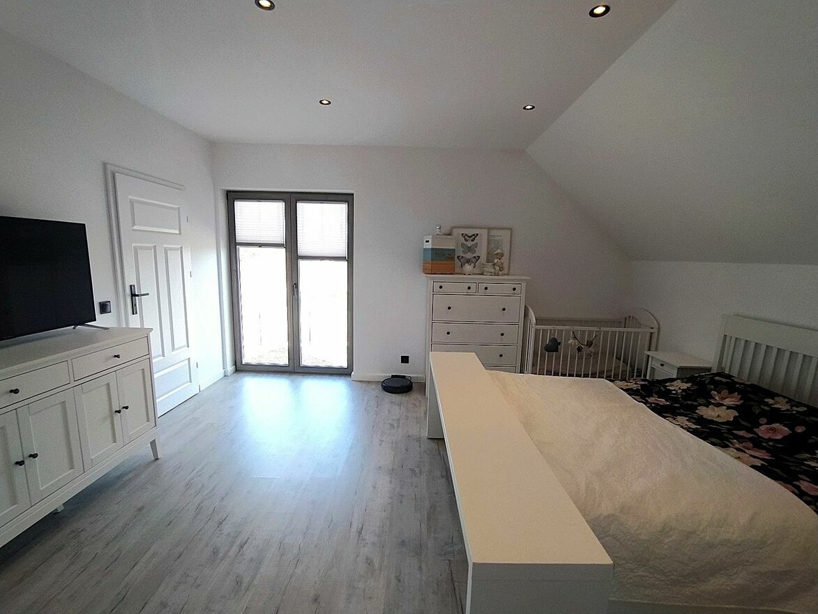 Na poddaszu znajdują się trzy niezależne sypialnie, w tym jedna bardzo duża o powierzchni około 20m2 z garderobą (5m2) i komfortowa łazienka z wanną i prysznicem o powierzchni około 11m2. Zarówno wszystkie pokoje jak i klatka schodowa są całkowicie wykończone w nowoczesnym stylu.